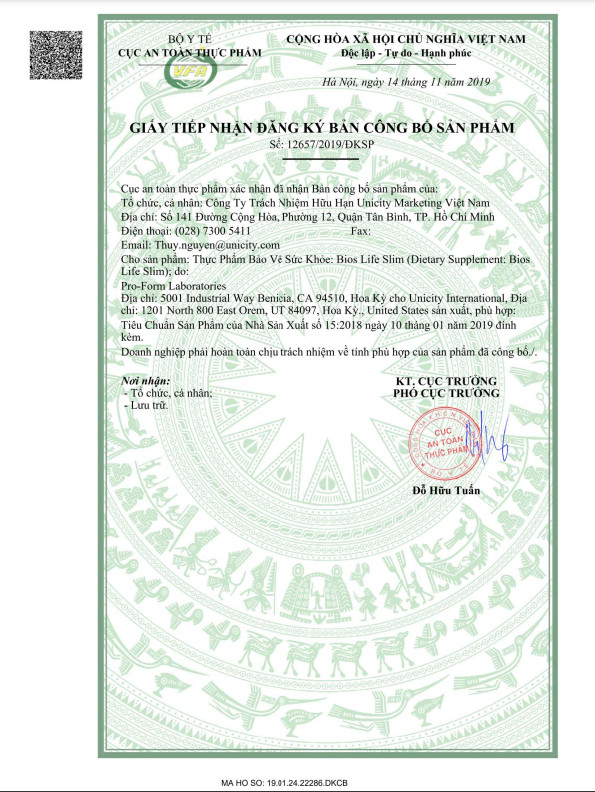 Tại Việt Nam, Bios Life Slim đã được Bộ Y Tế cấp giấy chứng nhận phù hợp quy định về an toàn thực phẩm và được phép lưu hành trên thị trường. Điều này khẳng định rằng sản phẩm hoàn toàn đáp ứng các tiêu chuẩn nghiêm ngặt về an toàn khi lưu hành trong nước.