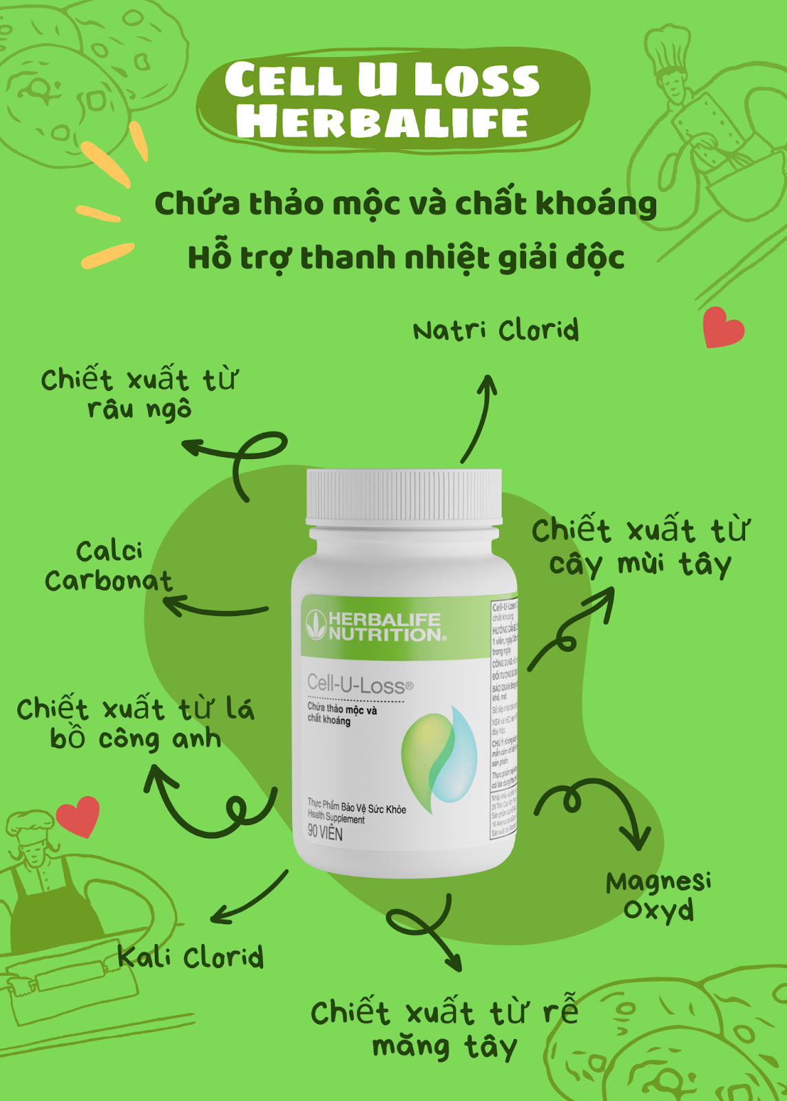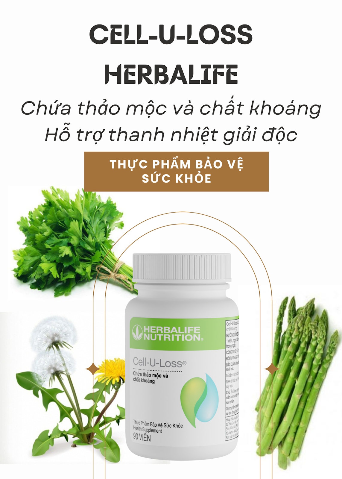 Cell U Loss Herbalife hỗ trợ giúp thanh lọc cơ thể, đào thải độc tố tích tụ qua đường bài tiết, hỗ trợ giảm bớt các triệu chứng như nóng trong người, nổi mụn nhọt, rôm sảy.